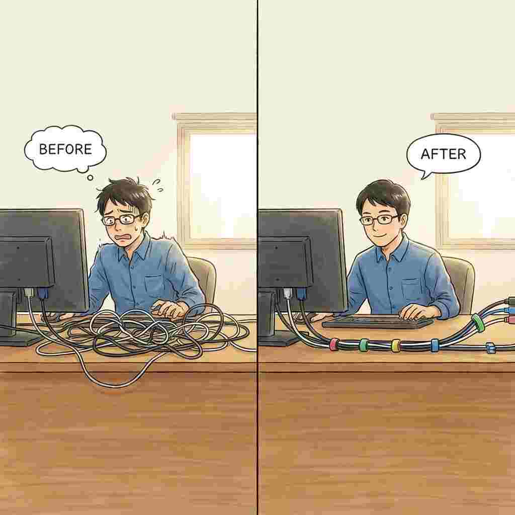 経営管理の仕事では、「一度やって終わり」ではなく、「続けられる仕組み」を設計することが重要です。配線整理も同じで、「片づける」ではなく「片づけなくても散らからない仕組み」を先に作る。この考え方に切り替えてから、配線整理がうまくいくようになりました。